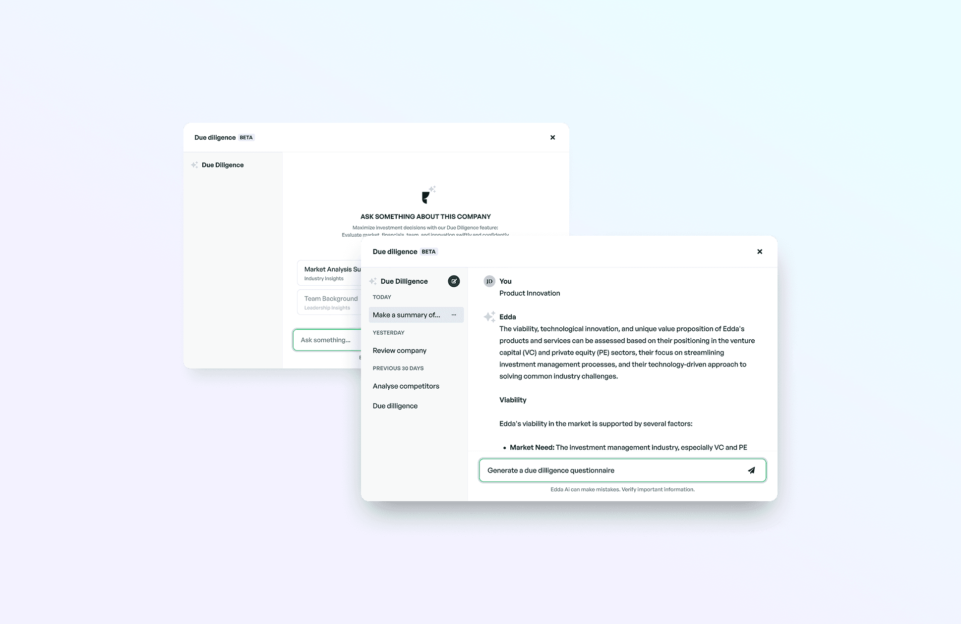 The emergence of large language models created a unique opportunity to rethink how investors interact with their data. While Edda already managed millions of data points for investment funds across the globe, artificial intelligence promised to transform this wealth of information into actionable insights and measurable productivity gains.